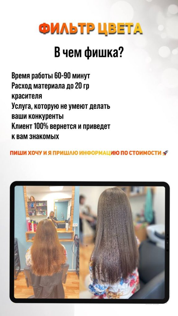 - Высокий чек с минимальным расходом материала — 15г. красителя на любую длину